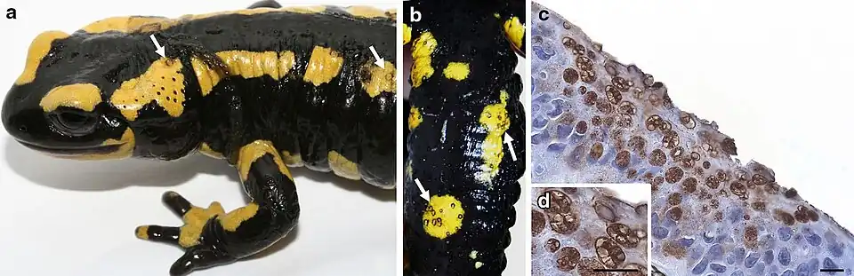 a) Feuersalamander (Salamandra salamandra), bei einem Ausbruch in Robertville, Belgien, mit mehreren Geschwüren (weiße Pfeile) und ausgeprägten Hautläsionen (schwarze Punkte auf gelber Haut);