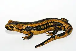 Feuersalamander mit Hautgeschwüren, verursacht durch Batrachochytrium salamandrivorans[1]