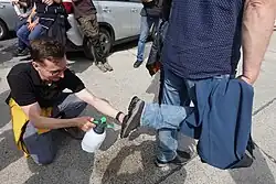 Desinfektion des Schuhwerk bei Exkursion der NABU Bundesstiftung und Biologische Station Hochsauerlandkreis im Naturschutzgebiet Wicheler Heide