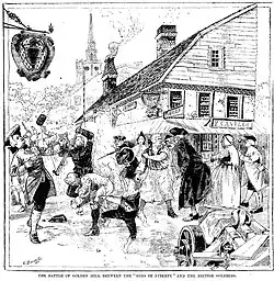 Am 19. Januar 1770 versuchten Isaac Sears und andere Mitglieder der Sons of Liberty, einige Soldaten von dem Verteilen von Flugblättern abzuhalten. Sears nahm einige der Soldaten gefangen und marschierte mit seinen Gefangenen zum Büro des Bürgermeisters, während der Rest der britischen Soldaten zur Kaserne rannte, um Alarm zu schlagen. Eine Menge Stadtbewohner kamen zusammen mit einer Vielzahl von Soldaten. Die Soldaten waren umzingelt und zahlenmäßig stark unterlegen. Mitsoldaten versuchten sie zu retten, wurden aber in ihre Kaserne befohlen. Als sie zu ihrer Kaserne eskortiert wurden, erreichten sie Golden Hill, wo ein Offizier sagte: „Soldaten, ziehen Sie Ihre Bajonette und schneiden Sie sich durch sie hindurch.“ Weitere Soldaten kamen und eine Gruppe von Offizieren traf ein, um die Soldaten zu zerstreuen, bevor die Situation völlig außer Kontrolle geriet.[4] Einige der Soldaten waren schwer verletzt und einer hatte eine schwere Wunde. Einige der Stadtbewohner wurden verwundet und einigen Quellen zufolge gab es einen Todesfall, obwohl dies umstritten ist.