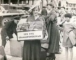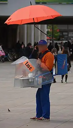 Ein Bauchladen ist ein Brett, ein Kasten oder eine andere Konstruktion, die vor dem Körper an einem Gurt getragen wird, um darauf oder darin Waren anzubieten. Sie kann auch verschiedene Fächer und Schubladen enthalten, in denen Waren und Geld gelagert werden können.[1] Der Tragegurt wird dabei traditionell über den Nacken geführt, die Hinterkante des Bauchladens stützt sich gegen den Bauch des Trägers. Teilweise ist auch noch ein zweiter Gurt vorhanden, der wie ein Gürtel um den Körper gelegt und mit einer seitlichen Schnalle verschlossen wird. Seitlich am Bauchladen können noch Ringe oder Haken angebracht sein, an denen weitere Waren aufgehängt werden.