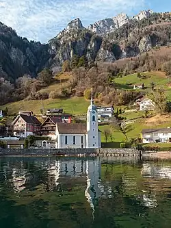 Oberhalb der Kirche, die der heiligen Ida oder Idda von Toggenburg geweiht ist, steht ein Denkmal für Pater Alberich Zwyssig, den in Bauen geborenen Komponisten des Schweizerpsalms, der Schweizer Nationalhymne.