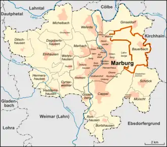 1964 kam es zu umfangreichen Umgemeindungen von Waldgebieten auf den Lahnbergen, damit die Neubauten der Philipps-Universität Marburg vollständig auf Marburger Gebiet liegen. Zum 1. Juli 1974 wurde die bis dahin selbständige Gemeinde Bauerbach im Zuge der Gebietsreform in Hessen kraft Landesgesetz in die Stadt Marburg eingemeindet.[6][7] Für den Stadtteil Bauerbach wurde ein Ortsbezirk eingerichtet.[8]
