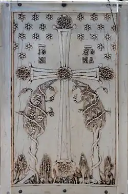 Seit dem 5. Jahrhundert und das ganze Mittelalter hindurch ist die Deutung des Kreuzes Jesu (lateinisch lignum crucis, „Holz des Kreuzes“) als Lebensbaum (lateinisch lignum vitae, „Holz des Lebens“; genannt auch Kreuzbaum) ikonographisch belegt. Dem todbringenden Baum der Erkenntnis („Baum des Todes“) wird im Sinne der Typologie das Leben spendende Kreuz („Baum des Lebens“) gegenübergestellt, z. B. in Form eines Ast- oder Baumkreuzes, von dem Zweige, Blüten, Blätter, Früchte oder Ranken ausgehen.[6]