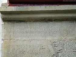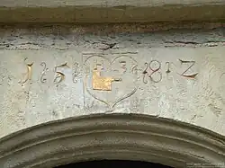 Löwenfratze und Datierung an der Ecke des Sockelgeschosses