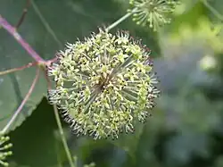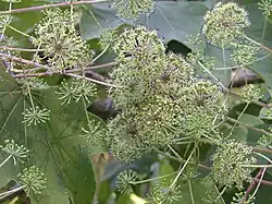 Der endständige, verzweigte, reichblütige 20 bis 30 cm breite und rispige Blütenstand ist aus doldigen Teilblütenständen zusammengesetzt, die einen Durchmesser von 1 bis 2,5 cm aufweisen. Die zwittrigen, radiärsymmetrischen und fünfzähligen, lang gestielten Blüten mit doppelter Blütenhülle erscheinen im Sommer. Die Kelchblätter, -zähne sind sehr klein am konischen, kahlen Blütenbecher. Die fünf ausladenden, klappigen und schmal-eiförmigen Kronblätter sind weißlich bis gelblich-grün. Es ist nur ein Kreis mit fünf vorstehenden Staubblättern mit rötlichen Antheren vorhanden. Zwei Fruchtblätter sind zu einem unterständigen Fruchtknoten mit kurzem Griffel mit zweiästiger Narbe verwachsen. Es ist ein Diskus vorhanden.