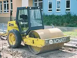 | Walzenzug | Für großflächige Verdichtungsarbeiten im Erdbau werden Walzenzüge verwendet. Sie besitzen vorne eine Walze mit Glatt- oder Schaffußbandage und am Heck eine konventionelle Luftbereifung. Unterhalb des Fahrerhauses befindet sich ein Knickgelenk. Die Verdichtung wird über die Vibrationsarbeit der Bandage erzielt, welche in zwei Frequenzen eingestellt werden kann. Diese Geräte werden aktuell mit einer Vielzahl von elektronischen Verdichtungskontrollsystemen ausgestattet (so genannte flächendeckende dynamische Verdichtungskontrolle). Mit diesem System wird die geleistete Verdichtung dokumentiert und flächenbezogen angezeigt. |