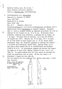 Der in einer scharfen Spitze endende Menhir ist etwa 3,35 Meter hoch, 20–36 cm breit und 10–15 cm dick. Der Stein ist in der Mitte etwas breiter. In den oberen Teil des Bautasteins wurden die Nr. H21 und ein Kreuz geschnitzt, da der Stein als Grenzstein diente.
