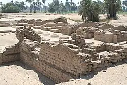 Daneben entwickelte sich aus dem luftgetrockneten Lehmziegel eine Bauweise, die die Entwicklung der ägyptischen Wohnkultur entscheidend bestimmte. Die ägyptischen Lehmziegel wurden aus dem lehmhaltigen Nilschlamm hergestellt. Seit der Naqada-I-Zeit war dieser das wichtigste Baumaterial. Diese „ökonomische“ und klimatisch vorteilhafte Bauweise machte zu allen Zeiten den Hauptteil der Wohnbauten und zeitweise auch der Sakralbauten aus. Sind zwar von vielen altägyptischen Städten nur noch die Steingebäude erhalten, so sind auch von dieser Bauweise insgesamt zahlreiche archäologische Reste vorhanden, die dazu ein gutes Bild ermöglichen.[1]