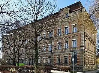 Der reich gegliederte Neurenaissance-Risalitbau wurde 1889–1890 unter Leitung des königlichen Baubeamten Gustav von Schacky errichtet.