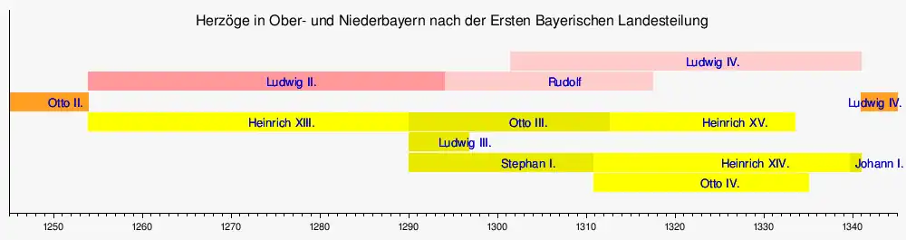 In der Bayerischen Landesteilung von 1255, auch als Erste bayerische Landesteilung bezeichnet, wurden das Herzogtum Bayern und die Pfalzgrafschaft bei Rhein am 28. März 1255 unter den beiden Söhnen Herzog Ottos II. († 1253) aufgeteilt. Ludwig II. erhielt das Herzogtum Oberbayern und die Pfalzgrafschaft, Heinrich XIII. das Herzogtum Niederbayern. Die beiden bayerischen Herzogtümer wurden 1340 unter Ludwigs Sohn Ludwig IV., Herzog von Oberbayern und römisch-deutscher Kaiser, wiedervereinigt.