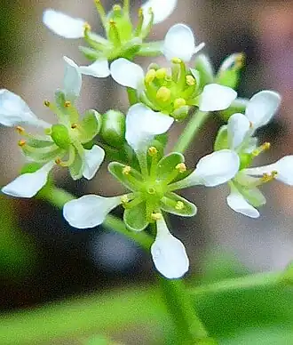 Die Kronblätter sind weiß und bis 7,5 mm lang.