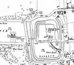 Die Erdwerke der Burg sind rechteckig angelegt und bestehen aus einem Wall und einem Graben, die eine Fläche von etwa 45.000 m² einschließen. Eine zweite Linie von Erdwerken schützte die nördliche Hälfte der Burg. Ein Donjon soll in der Nordostecke gestanden haben und der derzeitige Eingang zur Burganlage im südöstlichen Viertel erinnert an den ursprünglichen Eingang.[1][2]