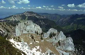 Die Gipfel der Bayerischen Voralpen bleiben – außer im Estergebirge ganz im Westen – unter der Höhe von 2000 m ü. NN und zeigen nur vereinzelt ausgeprägte Kalkfelswände.
