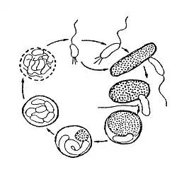 Die Art Vampirovibrio befällt die Alge Chlorella. Bdellovibrio, Bacteriovorax und Micavibrio greifen andere Bakterien an. Bdellovibrio dringt hierbei in den periplasmatischen Raum der Wirtszelle ein und ernährt sich vom Zytoplasma. Innerhalb der Wirtszelle vermehrt sich Bdellovibrio durch Zellteilungen. Nachdem das Zytoplasma aufgebraucht ist, wird die Zellwand der Wirtszelle aufgelöst und die Tochterzellen gelangen ins Freie.