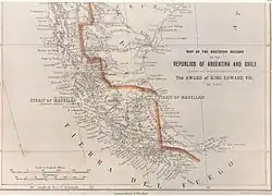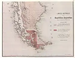 Die erste argentinischen Landkarte, die die im Vertrag von 1881 festgelegte Staatsgrenze wiedergibt, wenige Tage nach der Ratifizierung des Vertrages. Das hier wiedergegebene Exemplar wurde dem britischen Botschafter George Petre in Buenos Aires durch Bernardo de Irigoyen ausgehändigt. Irigoyen war als argentinischer Außenminister Unterhändler und Unterzeichner des Vertrages seitens Argentiniens. Das Original befindet sich im amtlichen britischen Archiv. Der britische Botschafter sendete es seiner Regierung mit der Bemerkung, dass die stark gefärbte Region „die Magellanstraße, die Hälfte Feuerlands und alle südlichen Inseln umfasst, das ist, was tatsächlich Chile im Vertrag gewährt wurde.“[2]:§122