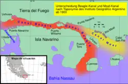 Nach der Entdeckung von Gold in Feuerland hielt der rumänische Abenteurer Julio Popper 1891 einen Vortrag im Instituto Geográfico Argentino (Vorgänger des Instituto Geográfico Militar), in dem er eine Theorie vorstellte, nach der der Beagle-Kanal nicht bis Cabo San Pío reiche, sondern bei Punta Navarro nach Süden zwischen die Inseln Navarino und Picton abbiege[6]:Seite 63. 1899 beauftragte die argentinische Marine den Kreuzer Almirante Brown unter dem Befehl von Kapitän Juan P. Saenz Valiente mit einer Forschungsreise in die Gewässer des Beagle-Kanals. Die argentinischen Forschungen bestätigten die argentinischen Thesen über eine Kursänderung des Kanals und aus diesem Grund erstellte das Institut neue Karten mit einer neuen Toponymie. Aus der Moat-Bucht (Bahía Moat) wurde der Moat-Kanal. Somit wurden die Insel Picton, Nueva und Lennox Terra Nullius (dt. ohne Besitzer) als zu Argentinien gehörig interpretiert, denn der Grenzvertrag von 1881 bezog sich in dieser Region nur auf Inseln „südlich des Beagle-Kanals“. Die Änderung wurde dem Vereinigten Königreich und den Vereinigten Staaten amtlich mitgeteilt, nicht jedoch Chile. Chile wurde 1904 erst durch eine neue Karte aus den USA auf die Änderung aufmerksam. Segundo Storni, damals Leutnant der Marine, später (1943) Außenminister Argentiniens, einer der geopolitischen Denker Argentiniens, rechtfertigte die Umbenennung so: