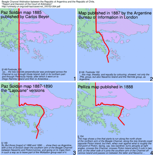 Das internationale Schiedsgericht im Beagle-Konflikt untersuchte das Kartenmaterial[4] zur Urteilsbestätigung. Unter den Landkarten gab es vier, deren Gültigkeit das internationale Tribunal nicht anerkannte. Es handelt sich um drei in Argentinien und eine von der argentinischen Botschaft in London publizierte argentinische Karten. Zu jeder von ihnen gab das Tribunal in seiner Begründung eine kurze Beschreibung, aus der sich die Karte rekonstruieren lässt (da sie ansonsten nicht frei verfügbar sind). (Siehe den Text zu jeder Karte).