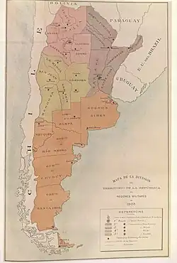 Wiedergabe der Karte Teilung der Republik in militärischen Bezirke – 1905, die im Boletín Militar (Heeresmitteilungen) des argentinischen Kriegsministeriums, Jahrgang IV, Band I, 1. Mai 1905, Nr. 140 erschien.