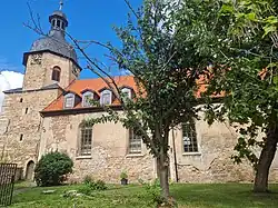 Im ummauerten Kirchfriedhof steht die dreiseitig geschlossene im Kern spätgotische Saalkirche, die im 18. Jahrhundert umgebaut wurde. Sie hat ein spitzbogiges Portal im Norden. Das Erdgeschoss des Kirchturms im Westen ist mittelalterlich. Im oktogonalen Aufsatz hängen zwei Kirchenglocken, die 1504 Heinrich Ziegeler gegossen hat. Bedeckt ist er mit einer welschen schiefergedeckten Haube, die eine offene Laterne trägt.