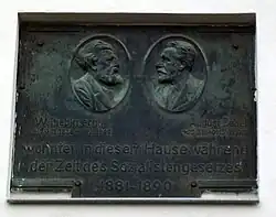 Jahrzehnte danach weihte die SPD mit einem großen Fest am 30. März 1930 – einen Tag nach dem Geburtstag von Wilhelm Liebknecht (1826–1900) – die Gedenk-Tafel für Bebel und Liebknecht am Haus in Borsdorf ein. Am Aufmarsch nahmen laut Polizeiangaben mindestens 6000 Sozialdemokraten und Reichsbannerleute teil (die Leipziger Volkszeitung nannte am 31. März 1930 gar 10000 Teilnehmer).[5] In der Nazizeit wurde die Tafel versteckt und am 1. Mai 1946 wieder am Hausgiebel angebracht, wo sie sich bis heute befindet.