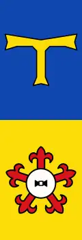 Banner: „Blau-Gelb im Verhältnis 1 : 1 quergestreift; oben in Blau ein schwebendes gelbes Antoniuskreuz, unten in Gelb eine fünfschenklige rote Lilienhaspel, belegt mit einem weißen Mühlstein.“ |