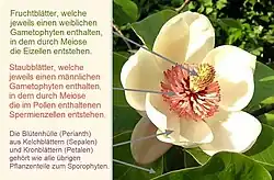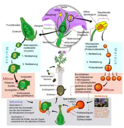 Bei der Entstehung der Samenpflanzen, zu denen auch die Bedecktsamer gehören, wurde der Generationswechsel, der bei den Farnen durch abwechselnde Ausbildung eines im Boden befindlichen Gametophyten und eines daraus hervorwachsenden Sporophyten stattfand, in die vom Sporophyten gebildete Blüte verlagert, in der der weibliche Gametophyt (Embryosack) verbleibt, während die männlichen Gametophyten (Pollenkörner) nach der Bildung in den Staubblättern freigesetzt werden. Bei den bedecktsamigen Blütenpflanzen sind die Samenanlagen und darin dasjenige Gewebe, das ursprünglich den weiblichen Gametophyten bildete, in ein geschlossenes Fruchtblatt eingehüllt, daher der Name Bedecktsamer. Der männliche Gametophyt der bedecktsamigen Blütenpflanzen besteht nur aus drei Zellen. Die Wände der Megasporen besitzen kein Sporopollenin. Es gibt eine doppelte Befruchtung und damit zusammenhängend ein sekundäres Endosperm.[2]