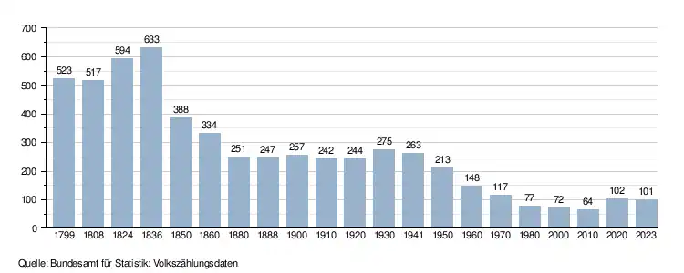 12. Daten der Eidgenössischen Volkszählungen ab 1850 nach Gemeinden. (XLSX; 10 MB) Bundesamt für Statistik, Neuchâtel, 12. Juli 2024, abgerufen am 11. Februar 2025 (Öffnung in Excel nur über "Anhang/Excel-Datensatz" möglich).