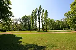 Die ehemalige Kiesgrube wurde zu einer abgesenkten, großen Freifläche modelliert. Die an den Rändern ansteigende große Volkswiese erfuhr durch den bewaldeten Trümmerberg im Osten eine lebhafte Betonung. Kreisförmig gepflanzte Baumgruppen erheben sich, oft leicht erhöht, wie kleine Inseln aus der Weite der Anlage. Sie nehmen das Modell des Pappelkranzes im kleinen wieder auf. Ein südliches Pendant bildet der große Ring aus Nadelbäumen im Süden.