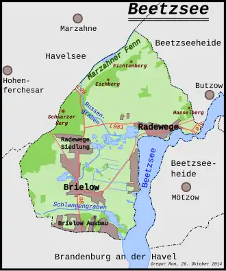 Mit den politischen Umwälzungen der Jahre 1989 und 1990 kam es wiederum zu Veränderungen. 1990 wurde der Bezirk Potsdam aufgelöst und ging im wiedergegründeten Land Brandenburg auf. Nach der Wiedervereinigung wurde 1993 der neue Landkreis Potsdam-Mittelmark gegründet, in dem der Landkreis Brandenburg aufging. Im Vorfeld der für 2003 geplanten brandenburgischen Gemeindegebietsreform schlossen sich zum 1. Februar 2002 Brielow, Radewege und Marzahne freiwillig zur Gemeinde Beetzsee zusammen.[36] Am 1. Januar 2008 wechselte Marzahne in die benachbarte Stadt Havelsee.[37] Im Zuge der Suburbanisierung um die Stadt Brandenburg in den Nachwendejahren verzeichneten Brielow und Radewege teilweise starke Zuzüge. In diesem Zusammenhang wurden neue Siedlungen mit Einfamilienhäusern errichtet.[38][30]