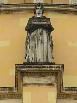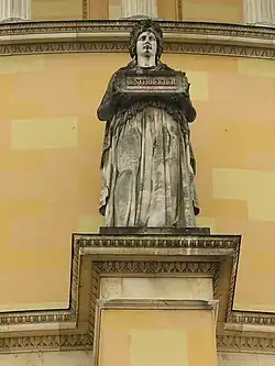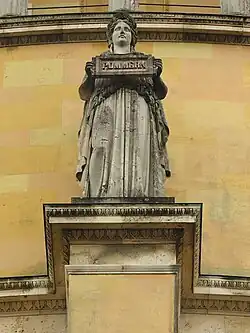 Die Höhe der Statuen beträgt jeweils 580 cm. Die im antiken Stil gewandeten, weiblichen Figuren wurden nach Modellen des Bildhauers Johann Halbig geschaffen und tragen in den Händen rechteckige Tafeln mit Inschriften in Majuskeln.