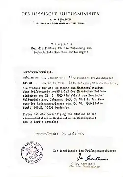 - ↑ Der Hessische Kultusminister zu dem Entwurf einer Vereinbarung über die Prüfung für den Hochschulzugang von besonders befähigten Berufstätigen in einem Schreiben an den Bundesverband Dritter Bildungsweg e. V. vom 23. Dezember 1975 – IIC 3 – 339/o -93-, S. 2.