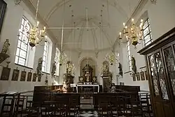 Die Beginenhofkirche St. Matthäus ist ein schlichtes, einschiffiges Bauwerk mit dreiseitigem Schluss. Im Innern ist das Bauwerk mit einem Tonnengewölbe geschlossen. Sie wurde in der Mitte des 15. Jahrhunderts erbaut, in den Jahren 1503/1504 mit einem hölzernen Gewölbe versehen und in den Jahren 1764–1787 barockisiert. Der Hauptaltar wurde in den Jahren 1785 bis 1788 von J. B. Casaer und dem Bildhauer P. J. Reable geschaffen.[3] Die einmanualige Orgel ist ein Werk eines unbekannten Orgelbauers aus dem Jahr 1679 mit acht Registern, das 2003 von Gerard Pels D’Hondt restauriert wurde.[4]