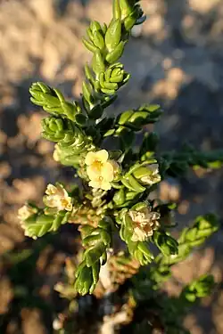 Die Blütezeit reicht von Oktober bis Mai. Die Blüten stehen einzeln oder bis zu fünft. Die zwittrigen oder eingeschlechtigen Blüten sind vierzählig und 4 bis 5 Millimeter lang. Die vier Kelchblätter sind innen gelb, außen weiß seidig behaart.