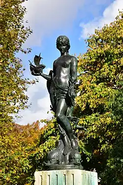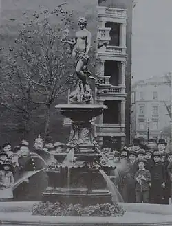Der Brunnen wurde 1890 vom Altonaer-Ottenser Verschönerungsverein zu Ehren des Altonaer Bürgermeisters Caspar Behn (1799–1853) errichtet und stand ursprünglich an der Kreuzung von Goethestraße und Allee (der heutigen Max-Brauer-Allee). Das Erscheinungsbild des gesamten Brunnens war völlig anders als heute: In einem runden Bassin stand eine Säule aus Granit, die ein Muschelbecken stützte, über dem die heute noch erhaltene Bronzefigur stand. Der Brunnen wurde im Zweiten Weltkrieg zerstört, die Figur blieb jedoch erhalten und wurde eingelagert (und zwar nach Darstellung des Hamburger Abendblattes anlässlich der Wiederaufstellung zunächst im Bauhof und dann „im Amtszimmer des Altonaer Bezirksamtsleiters“). 1963 wurde sie an ihrem heutigen Standort am Rande einer 1958 angelegten Grünanlage[4] in einem wesentlich einfacher gestalteten Brunnen wieder aufgestellt.[5][2][6]