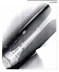 Röntgenaufnahme eines Fitbone-Implantates im rechten Oberschenkelknochen nach distaler Quer-Osteotomie - Fitbone von der deutschen Firma Wittenstein intens (Markteinführung 1997) wurde in Zusammenarbeit mit Rainer Baumgart entwickelt. Die Distraktion wird über einen integrierten Motor und ein mehrstufiges Getriebe erreicht, welches eine Gewindestange antreibt. Die benötigte Energie wird durch Induktion über einen unter die Haut implantierten Empfänger zugeführt, der Patient muss ein Steuerungsset bedienen.