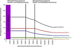 Der Beitrag zur gesetzlichen Renten-, Arbeitslosen-, Kranken- und Pflegeversicherung wird jeweils in einem Prozentsatz vom sozialversicherungspflichtigen Arbeitsentgelt bemessen. Übersteigt das Arbeitsentgelt die Beitragsbemessungsgrenze, wird der Versicherungsbeitrag von diesem Grenzbetrag erhoben. Vom Erreichen der Beitragsbemessungsgrenze an bleiben die absoluten Beiträge zur jeweiligen Versicherung konstant, sodass der prozentuale Anteil am Bruttoeinkommen sinkt.