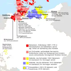 In Gottorf einigten sich die Teilnehmer zudem darauf, auch für die Ansprüche des Herzogs Christian Albrecht von Schleswig-Holstein-Gottorf (und seines Bruders, des Lübecker Fürstbischofs August Friedrich von Schleswig-Holstein-Gottorf) eine Verhandlungslösung zu bemühen, doch sowohl Frankreich als auch Brandenburg widersetzten sich kaiserlichen, lüneburgischen und schwedischen Forderungen, dies ultimativ mit der Lösung der Hamburger Frage zu verbinden.[19] Die diesbezüglichen Verhandlungen begannen deshalb erst 1687 in Altona und führten erst 1689 zum Altonaer Rezeß, demzufolge Christian V. die eingezogenen Besitzungen des Herzogs wieder herausgab. Ungelöst blieb zunächst der dänisch-lüneburgische Gegensatz, der sich 1689 mit dem Aussterben der Askanier-Herzöge von Sachsen-Lauenburg wieder verschärfte. Als Herzog Georg Wilhelm von Lüneburg das auch von Dänemark beanspruchte Lauenburg besetzen ließ, antwortete Christian mit der Belagerung, Beschießung und Zerstörung der lauenburgischen Hauptstadt Ratzeburg. Dänemarks Verbündeter Frankreich war jedoch inzwischen mit dem Pfälzischen Erbfolgekrieg beschäftigt; ohne französische Hilfe musste Christian V. im Hamburger Vergleich (1693) schließlich auch seine Ansprüche auf Lauenburg aufgeben. Statt mit den Niederlanden oder Frankreich verbündete sich Dänemark 1699 mit Russland und Sachsen-Polen. Im Großen Nordischen Krieg belagerte Dänemark 1712 Hamburg noch einmal (und ließ sich für den Abzug 246.000 Taler bezahlen)[3][1] und eroberte Bremen-Verden, besetzte 1713 erneut Schleswig-Holstein-Gottorf und eroberte 1715/16 schließlich auch Wismar und Teile Vorpommerns.