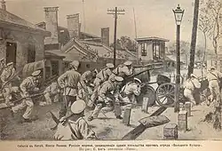 Die Chinesen versuchten zunächst, die Ausländer im Gesandtschaftsviertel mit Hilfe von Feuer zu vernichten. Zu Beginn der Belagerung legten sie mehrere Tage lang Brände in den Gebäuden rund um die britische Gesandtschaft. Am 23. Juni brannten die meisten Gebäude der Hanlin-Akademie nieder, darunter die Nationalbibliothek Chinas, und ihre Bücher, von denen viele unersetzlich waren. Beide Seiten machten sich gegenseitig für die Zerstörung verantwortlich.[18] Die chinesische Armee wandte sich daraufhin dem „Fu“ zu, dem Zufluchtsort der meisten chinesischen Christen und der Domäne des japanischen Oberstleutnants Goro Shiba. Shiba und seine kleine Gruppe japanischer Soldaten verteidigten sich geschickt gegen die Chinesen, die hinter beweglichen Schutzpalisaden vorrückten, immer näher an die Japaner heranrückten und sie allmählich zu umschließen drohten.[19] Verzweifelte Kämpfe fanden in der Nähe der französischen Gesandtschaft statt, wo 78 Franzosen und Österreicher sowie 17 Freiwillige in einem verwinkelten städtischen Gelände, in dem die Frontlinien nur 15 m voneinander entfernt waren, angegriffen wurden. Die Franzosen befürchteten außerdem zu Recht, dass chinesische Pioniere unter ihren Stellungen Tunnel für Minen graben würden.[20]