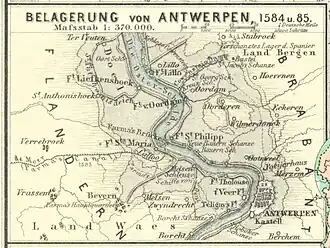 Die spanischen Truppen waren unter Alexander Farnese laufend verstärkt worden und zählten im Jahre 1584 schließlich 61.000 Mann. Alexander Farnese hatte dabei darauf geachtet, dass die Nachschublinien der Spanier durch in regelmäßigen Abständen errichtete Festungen geschützt waren und die Truppen zuverlässig versorgt wurden. Zu Beginn der Belagerung Antwerpens waren die spanischen Truppen daher gut ausgerüstet. Zunächst wurden Belagerungsringe um Antwerpen gebaut und Forts entlang der Schelde errichtet, ohne große Angriffe gegen die befestigte Stadt zu versuchen. Es war jedoch nicht möglich, die halbkreisförmig an der breiten Schelde liegende Stadt völlig einzuschließen. Auf dem Fluss konnten die Antwerpener die Belagerung insbesondere nachts und bei günstiger Gezeitenströmung immer wieder umfahren.[1]