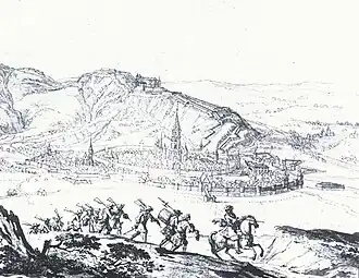 ![]() Belagerung von Freiburg 1677. Die Vorstadt Neuburg ist im Bild links. | |||||||||||||||||