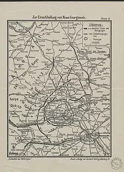 Nachdem die russischen Truppen am Narew eine Niederlage erlitten hatten und sich zurückziehen mussten (→ Großer Rückzug), gingen die deutsche 12. und 9. Armee zur Verfolgung über. Die Armeegruppe Beseler konnte nunmehr Nowogeorgiewsk angreifen. Da die Bahnlinien jedoch überdehnt und überlastet waren, dauerte es bis zum 4. August, bis schwere Artillerie und Granaten herangebracht waren. Zunächst gingen die 21. Landwehr-Brigade und die Brigade Pfeil (Kommandeur Traugott von Pfeil) gegen die russischen Brückenköpfe Dembe und Zegrze vor. Nachdem diese die vordersten russischen Stellungen erobert hatten, wichen die Russen in der Nacht vom 6./7. August über den Narew aus und zerstörten die Brücken, wodurch aber auch der letzte Rückzugsweg für die Festungstruppe zerstört wurde. Südlich von Nowogeorgiewsk marschierte das Detachement Westernhagen (von der 9. Armee) heran und schloss die Festung auch von Süden ein. Am 9. August blockierte schließlich die 169. Landwehr-Brigade die Festung auch im Südosten. Nachdem die russischen Truppen am 10. August das Sperrfort Benjaminow aufgegeben hatten, war Nowogeorgiewsk vollständig eingeschlossen.[7]