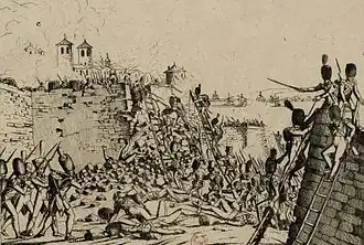 - ↑ Jakob Klaus, ein aus der Pfalz stammender Voltigeur des an der Belagerung beteiligten 117. französischen Linienregiments, hinterließ eine eindringliche Schilderung dieses Massakers. Vgl. dazu Joachim Kermann: Pfälzer unter Napoleons Fahnen. Veteranen erinnern sich. Erlebnisberichte anlässlich der 200. Wiederkehr der Französischen Revolution. (= Sonderdruck 6 der Bezirksgruppe Neustadt im Historischen Verein der Pfalz e. V.), Neustadt an der Weinstraße 1989, S. 98ff.