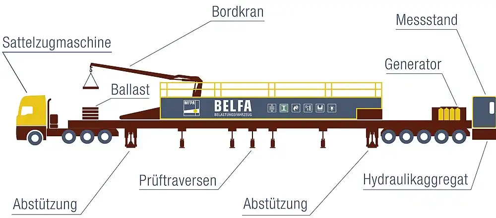 Eine Forschungskooperation aus Hochschule Bremen (Projektleitung), TU Dresden, HTWK Leipzig und Bauhaus-Universität Weimar erforschte ab 1989 in zwei vom Bundesministerium für Bildung und Forschung (BMBF) geförderten Projekten die wissenschaftlichen Grundlagen für experimentelle Tragsicherheitsbewertungen im Bereich des Hoch- und Brückenbaus. Daraus ging u. a. die DAfStb-Richtlinie für Belastungsversuche an Betonbauwerken hervor.[1] Um Straßenbrücken effizienter prüfen können, befasste sich die Forschungskooperation von 1999 bis 2002 mit der ebenfalls vom BMBF geförderten Entwicklung des BELFA.[2] Es sollte ein System entwickelt werden, das im Gegensatz zur bisherigen Prüftechnik[3] schnell und flexibel einsetzbar ist, keine langen Sperrungen erfordert und ohne Eingriffe in die Bauwerksabdichtung auskommt. Nach mehreren Iterationsschritten stand das endgültige Konzept des BELFA: Ein Sattelzug für die Untersuchung von Brücken, optimal bis 18 m Stützweite und einer maximalen Prüflast von 1500 kN. Damit können die üblichen Brückenklassen überprüft werden. Dieses Fahrzeug ist weltweit einmalig. Nach dem Bau und der Erprobung des Gerätes fand der erste Einsatz im Jahre 2001 an einer Straßenbrücke in Neu Kaliß, Mecklenburg-Vorpommern, statt.[4] Seit 2015 kommt das Belastungfahrzeug für die Materialprüfungsanstalt Leipzig (MFPA Leipzig GmbH) zum Einsatz.