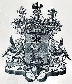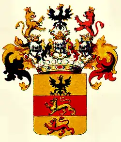 Schild von Gold, Rot und Gold quergeteilt; oben in Gold ein schwarzer, gekrönter und goldbewehrter Adler; in der Mitte in Rot ein goldener und unten in Gold ein roter, gekrönter nach der rechten Seite schreitender Löwe. Über der Grafenkrone stehen drei gekrönte Helme. Der rechte trägt wachsend und einwärtsgekehrt den goldenen Löwen der mittleren Abteilung des Schildes, der mittlere den Adler der oberen Abteilung und der linke wachsend den roten Löwen der unteren Abteilung des Schildes. Die Helmdecken sind rechts schwarz und golden, links rot und golden. Den Schild halten zwei einwärtssehende silberne Greife. – Häufig erscheint das Wappen ohne die Schildhalter.[4]