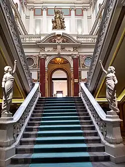 Es wurde mit gemischten Techniken gemauert. Die Keller, die sich unter dem gesamten Gebäude erstrecken, wurden aus Eisenbeton mit preußischen Kappendecken ausgearbeitet. Der Großteil des Gebäudes ist im klassischen Verfahren gemauert, mit Ziegeln und Kalkmörtel, und nur teilweise mit Eisenbeton. Die Überbrückung geschieht durch Unterbalken in den Seitenflügeln und durch Unterbalken und Bögen im mittleren Flügel. Die Konstruktion der Laterne über der zentralen Treppe ist in Form eines dreieckigen Metallgitters gelöst. Die Dächer sind mit Oberbau, kleinen Gefällen und mit Kuppeln versehen. Die äußeren Fassaden zu den Straßen hin sind im Sockelbereich mit Steinplatten verkleidet und in Kunststein verarbeitet. Die inneren zum Hof hin sind hingegen verputzt. Die Tragekonstruktion bei den meisten Jochen stellen neben Bögen auch Marmorsäulen dar. Die Treppen sind dreiläufig, aus Stein oder Marmor. Die Hilfstreppen hingegen sind Spindeltreppen aus Eisen. Die Innenwände sind verputzt und ausgemalt. In den repräsentativen Räumen sind sie zudem verziert mit Wandmalerei und Marmorimitat, Pilastern mit vergoldeten Kapitellen und applizierten polychromen dekorativen Frauenmasken. Die Böden sind aus Parkett oder Terrazzo. Dekorative Arbeiten sind an den Fassaden in Kunststein ausgearbeitet und im Inneren in Stuckplastik und Gips.