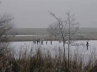 Zugefrorener Bellacher Weiher mit Schlittschuhläufern