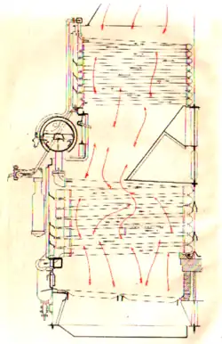 Es handelt sich um einen Wasserrohrkessel, bei dem die (anfangs gusseisernen, später gezogenen, stählernen) Verdampferrohre annähernd horizontal (ca. 3° geneigt) durch den Feuerraum über dem Rost geführt sind. Jeweils zwei übereinanderliegende Rohrpaare sind seitlich außerhalb des Feuerraumes über eine kleine Wasserkammer verbunden, so dass insgesamt eine Reihenschaltung der Ebenen in Zick-Zack-Anordnung entsteht. Über dem Verdampferteil liegt seitlich die Trommel, über der sich bei späteren Typen ein Speisewasservorwärmer (Economiser) mit ebenfalls horizontalen Rohren anschließt.[3][4][2]