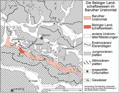 Zählt der Hohe Fläming noch zur Altmoränenlandschaft der Saale-Eiszeit, gehören die Niederungen innerhalb des Urstromtals bereits zum Jungmoränenland der Weichsel-Eiszeit, deren Inlandeis in der Talung seine maximale Ausdehnung nach Süden erreichte. Die Abflussbahn der Schmelzwasser entstand vor rund 21.000 Jahren und hinterließ mit dem Baruther Urstromtal einen im Mittel rund drei bis fünf Kilometer breiten Talboden, der nach der Verlagerung des Urstromes nach Norden (zum Berliner Urstromtal) zwischenzeitlich trocken fiel. Wie alle Urstromtäler bestehen auch die Belziger Landschaftswiesen im Untergrund aus mächtigen Schmelzwassersanden. Das Schmelzwasser erodierte an einigen Stellen stark am Nordhang des Fläming und schnitt bis zu 60 Meter aufragende Geländestufen heraus.