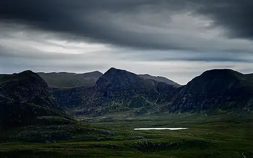 Als Landschaftstypen finden sich neben den schroffen Felsaufbauten des Bergstocks auf seinen unteren Hängen ausgedehnte Moore, in den flacheren Lagen sodann ihn umgürtende Heiden, zahlreiche kleine Seen (die so genannten lochans), Torfniederungen sowie die bereits angeführte Seenkette im Nordosten.[8] Ansiedlungen mit ihren Crofts beschränken sich auf Küstennähe.